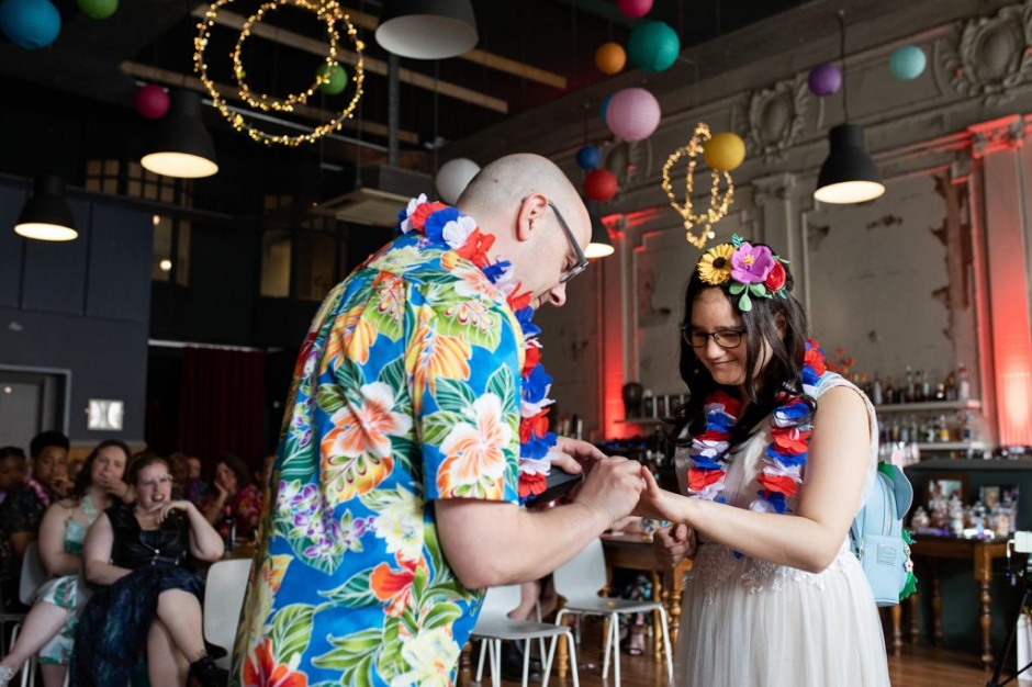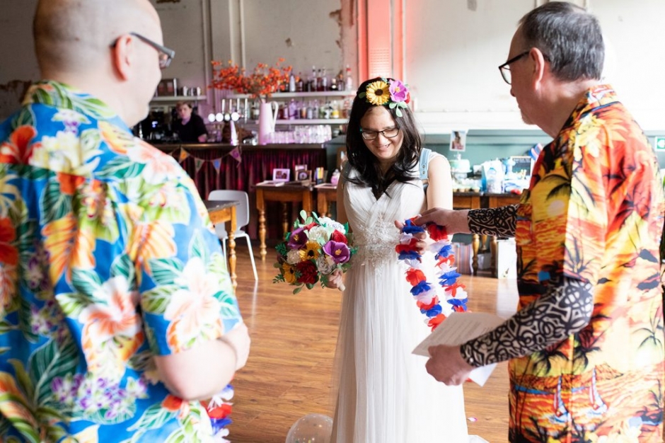 Dan’s Dad conducted their ceremony, incorporating some Hawaiian traditions. He even surprised the couple by stripping off his traditional suit at the beginning of the ceremony, as he was wearing some more fitting attire underneath, it was a really funny start.