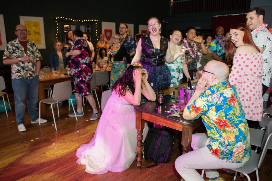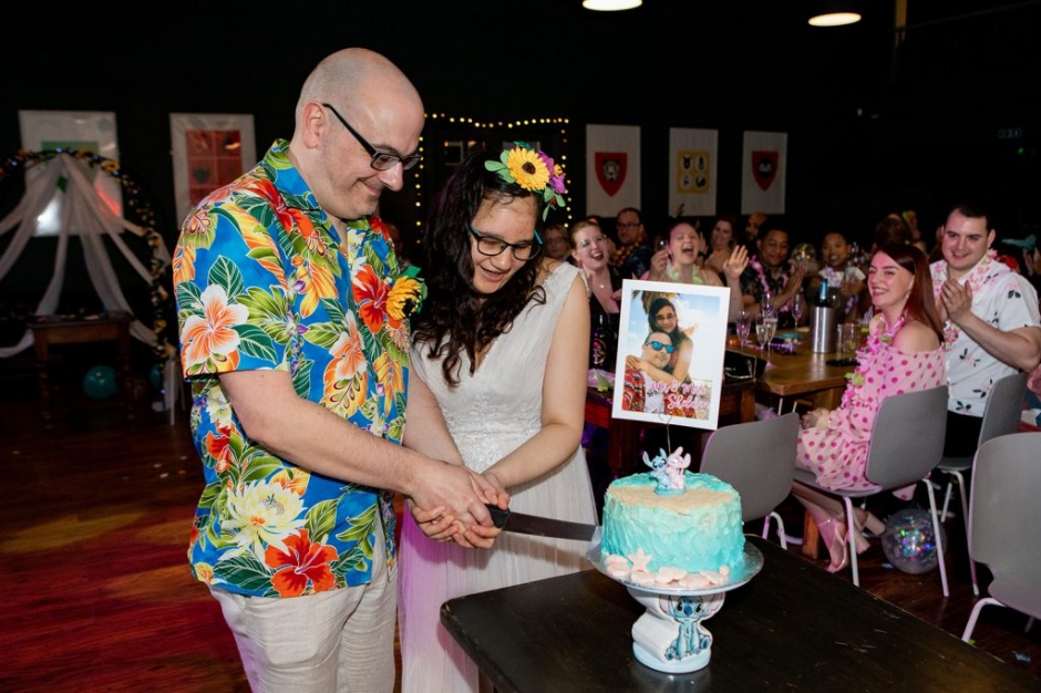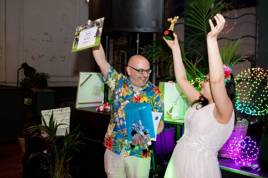 Instead of the usual wedding presents, the couple asked their guests to take part in a Taskmaster style challenge, and the guests were tasked with bringing something blue to the wedding for their gift table. The guest who brought the most interesting thing was rewarded with a trophy.Wow their guests were imaginative! Everything from kids games, to bath mats to blue sweeties… the winner was a guest who bought a donkey adoption on their behalf, called Blue! NB. The donkey wasn’t invited to the wedding but I get the feeling if he was, he would have joined in the party for sure!