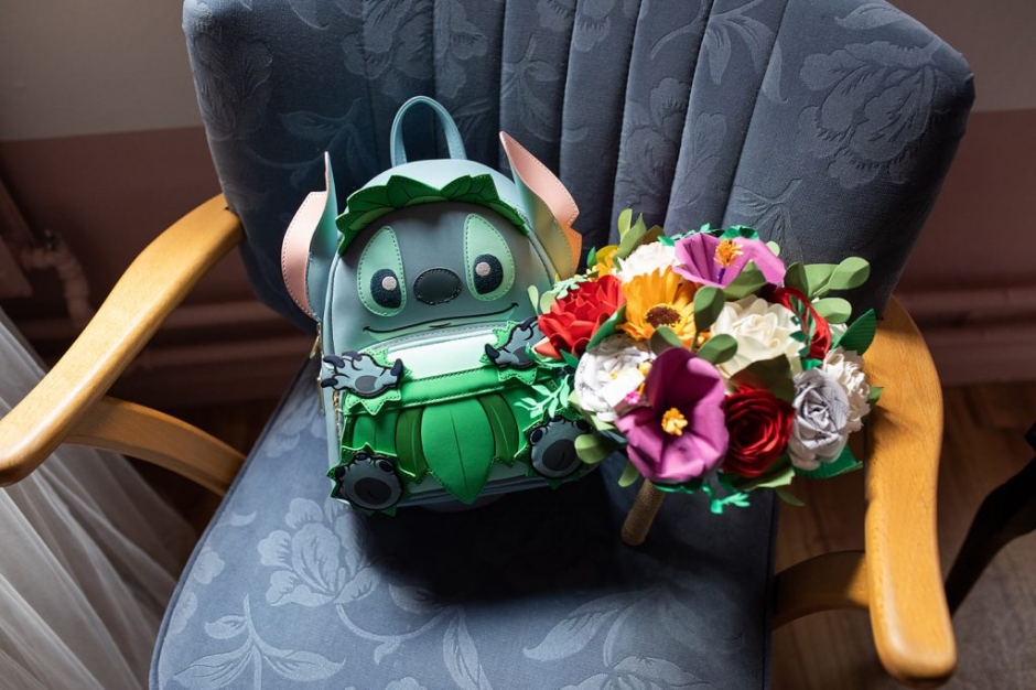 They chose to have a laid back, non-traditional wedding. Shell loves Disney, and Lil0 & Stitch in particular, and even walked down the aisle wearing her Stitch backpack. Dan wore an authentic shirt from Hawaiian shirt shop.