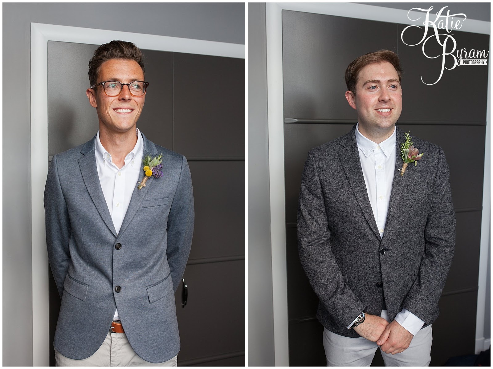 As the guests were waiting for the grooms to arrive both Andrews were peeking around the corner to see if it was time for them to get married yet.